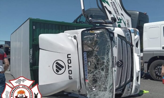 Una vez en el lugar constataron que los vehiculos involucrados eran dos camiones de gran porte (un volcador y un semi de cargas generales), se desconoce la causa de la colision, pero esto derivó en que uno de los vehiculos terminara volcado sobre la calzada de la autopista, y el otro sobre la banquina de la misma.
