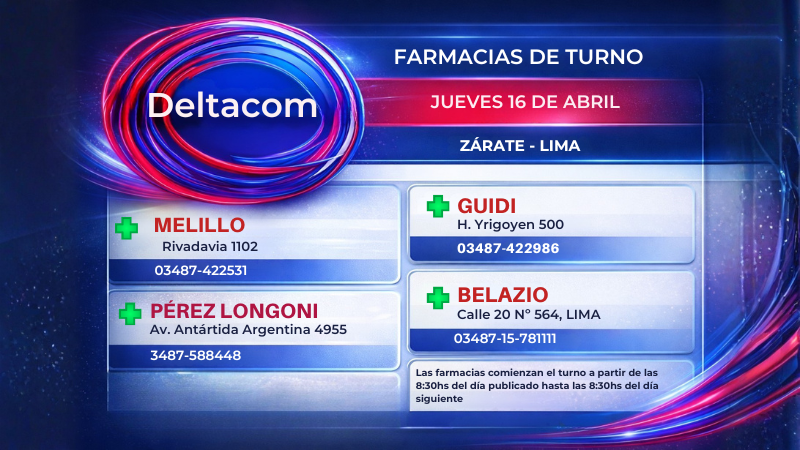 ActualidadDestacadosGeneral Farmacias de turno en Zárate y Lima: Jueves 16/04/2026 Por redaccion - abril 16, 2026 0 19 FacebookTwitterPinterestWhatsApp