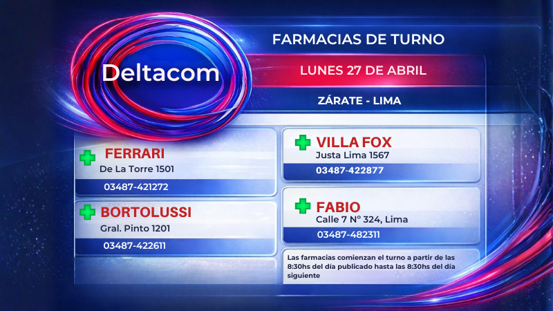 ActualidadDestacadosGeneral Farmacias de turno en Zárate y Lima: Lunes 27 de Abril de 2026 Por redaccion - abril 27, 2026 0 22 FacebookTwitterPinterestWhatsApp