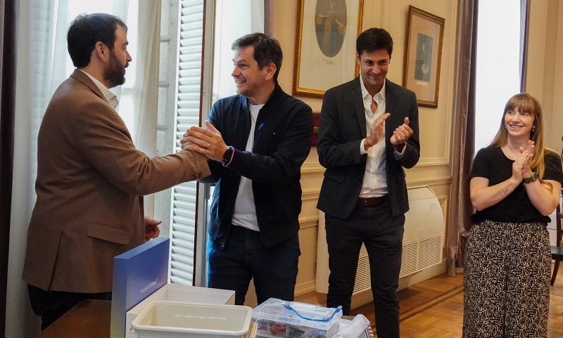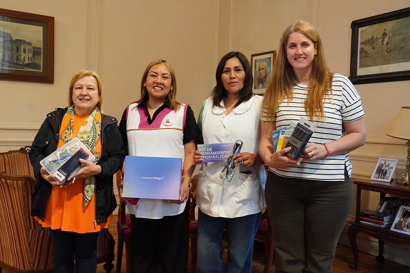 Los representantes de Fundación Mirgor, junto al Intendente Municipal, Marcelo Matzkin, el secretario de Producción, Ariel Larralde, y la subsecretaria de Educación, Olga Garmendia procedieron a la entrega de los mencionados kits a las escuelas EP33, EP 1, EP26, EP21, y EP 28.