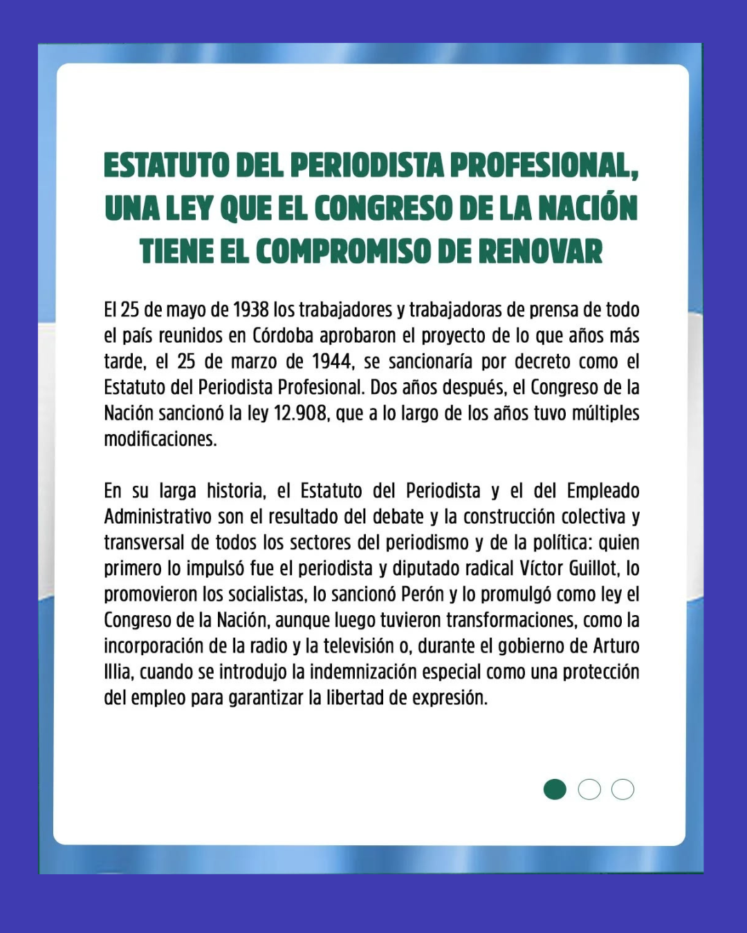La organización recordó que el 25 de marzo de 1944 se sancionó por decreto el Estatuto del Periodista, luego de que el proyecto fuera aprobado en 1938 por trabajadores de prensa de todo el país reunidos en Córdoba. Dos años más tarde, el Congreso nacional lo convirtió en ley, dando origen a una de las normativas laborales más emblemáticas para la actividad periodística en la Argentina.