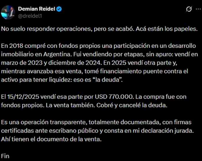Desde sus redes sociales, Reidel aclaró que, en el año 2018, “compró con fondos propios una participación en un desarrollo inmobiliario” en nuestro país y que “tomó financiamiento puente contra el activo para tener liquidez”.
