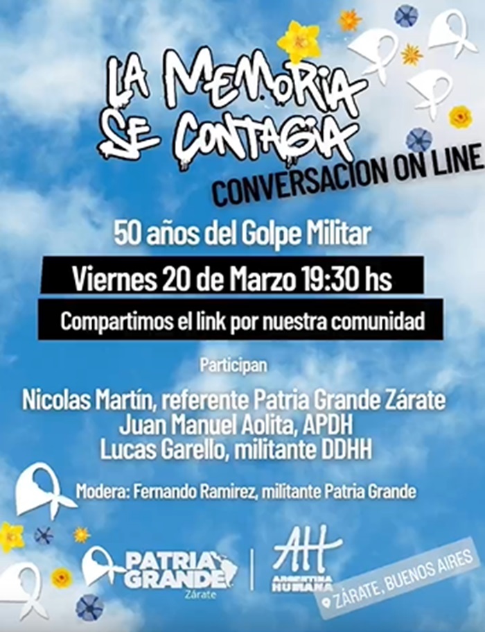 En el marco de la Campaña “La Memoria se contagia” Patria Grande Zárate llevará a cabo un encuentro por el 24 M junto con organismos de Derechos Humanos de la zona.